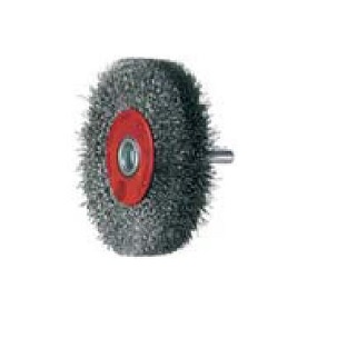 DESCRIPTION: Cepillo metalico circular con eje, hilo ondulado para máquinas electro-portátiles frontales. Se aplica para eliminación de óxidos y barnices, y preparación de supurficie antes de barnizar. Max. 15.000 rpm